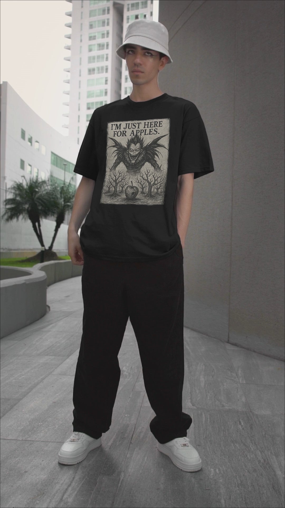 This Death Note inspired tee features Ryuk, the apple-loving Shinigami, with his menacing grin, wild wings, and eerie manga-style detailing. Above him, the bold line “I’m Just Here for Apples” captures his iconic obsession, while below, a haunting orchard of twisted trees leads to a single ominous apple at the center—symbolizing temptation and chaos. Rendered in a gritty, hand-sketched style on a dark base, the design mirrors the raw energy of the anime and manga, making it instantly striking and unforgettable.