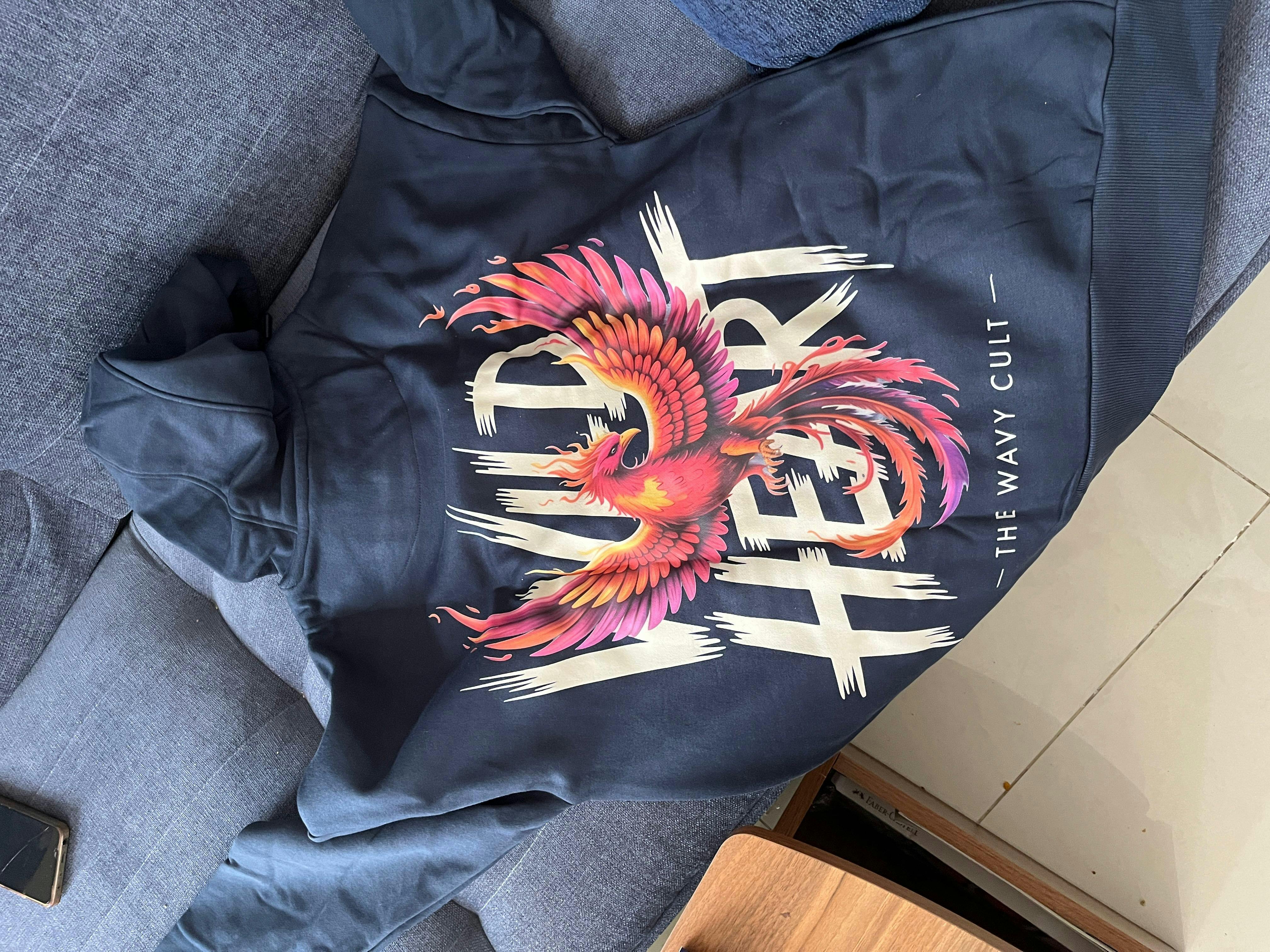 The back bursts with energy and fire. A majestic phoenix, painted in vibrant reds, oranges, and golds, dominates the space — a universal symbol of rebirth, strength, and transformation. Behind it, the bold lettering “WILD HEART” slices through the design with raw force, amplifying the fearless and untamed spirit the phoenix represents.