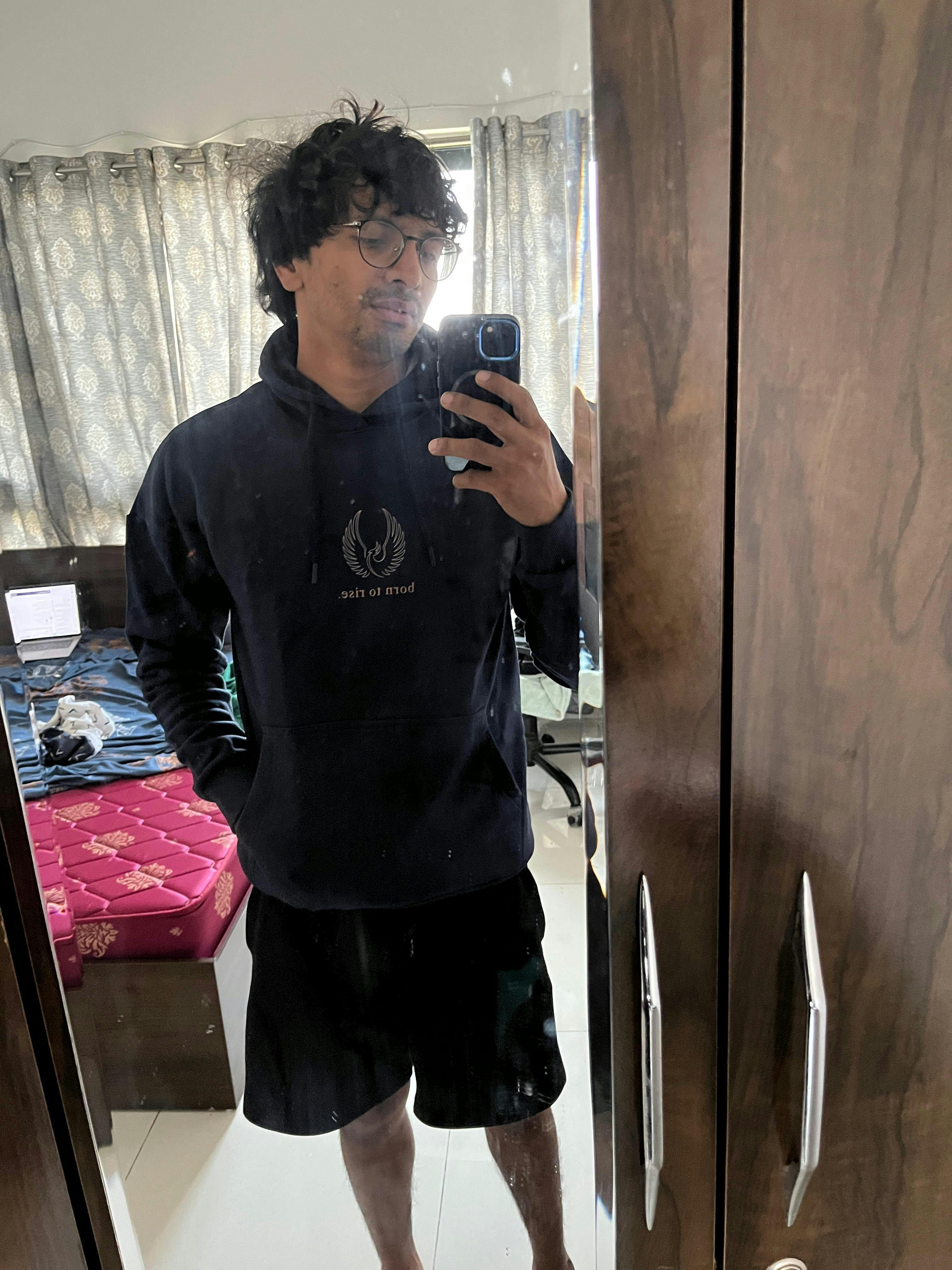 The front is kept minimal yet meaningful. At the center is a delicate phoenix emblem, wings stretched upward, paired with the words “born to rise.” This simple phrase carries a powerful message: no matter the fall, there is always the strength to rise again. The muted tones and clean placement make it subtle, almost like a quiet whisper of resilience.